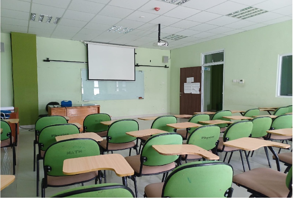 Ruang kuliah PS Pendidikan Matematika dilengkapi dengan fasiliats berupa LCD, papan Tulis dan pendingin ruangan (AC)